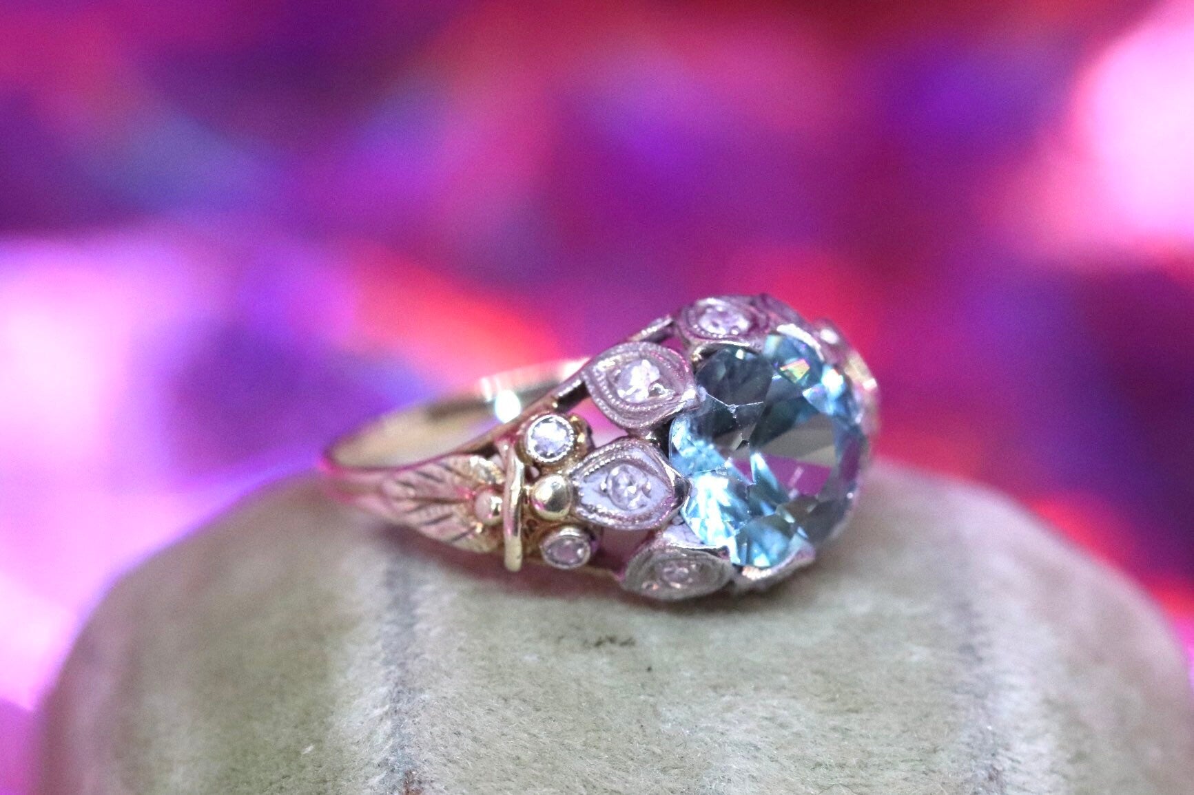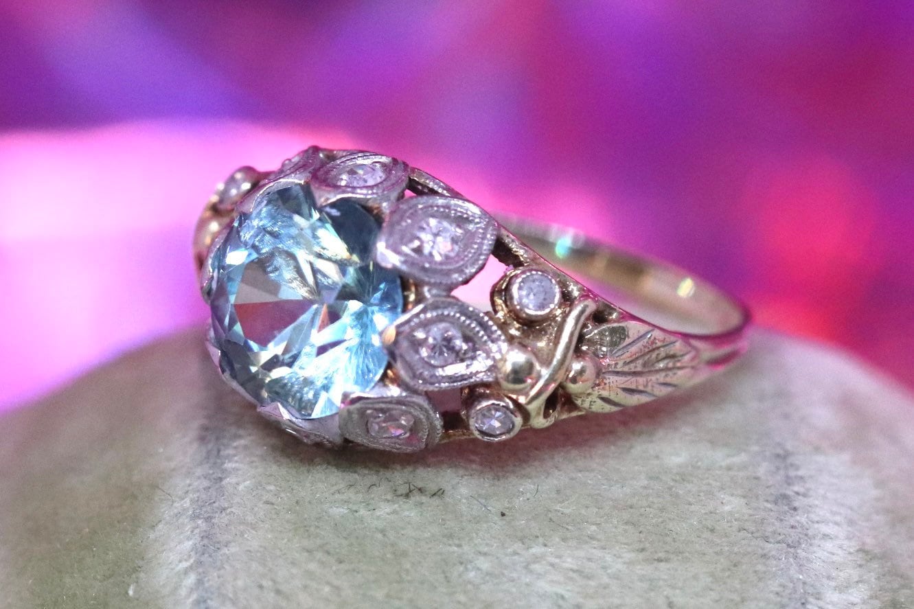 14k blue zircon and diamond ring set in 14k yellow gold size 6