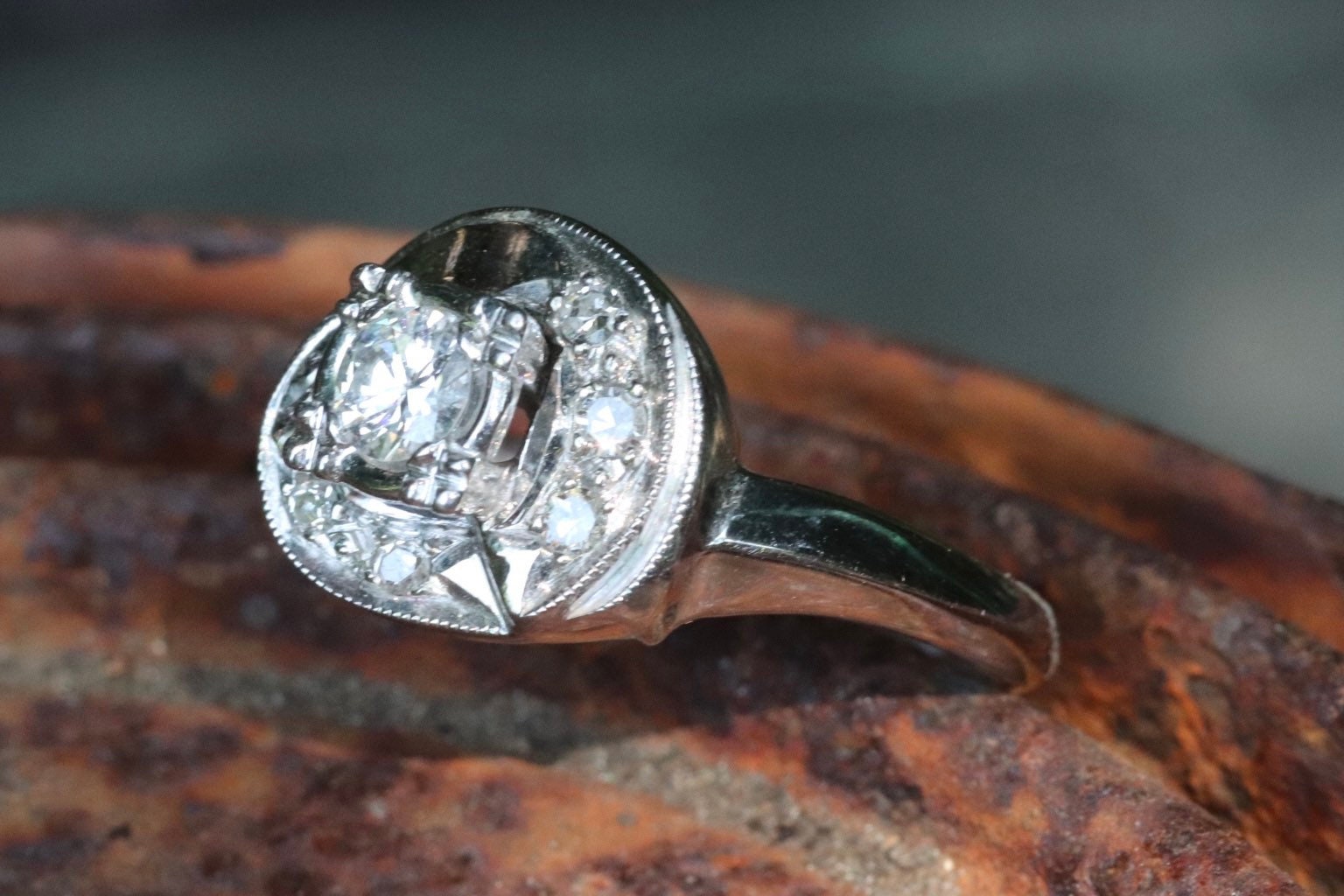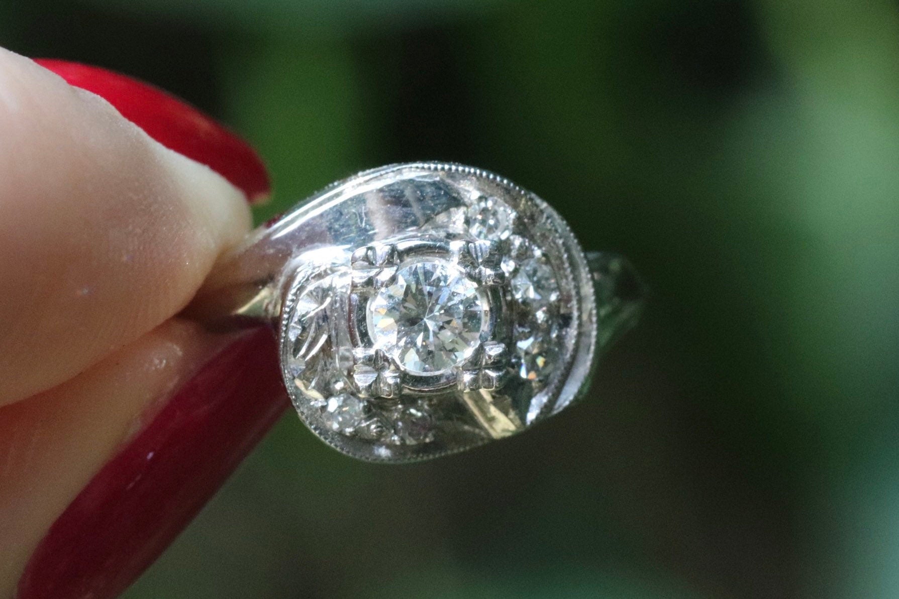 1940s retro swirl diamond engagement ring in 14 karat white gold size 6