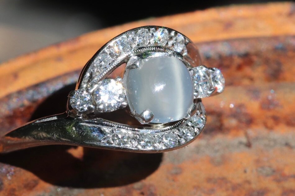 1950s cats eye platinum moonstone and natural diamond ring size 5.75 (sizable)