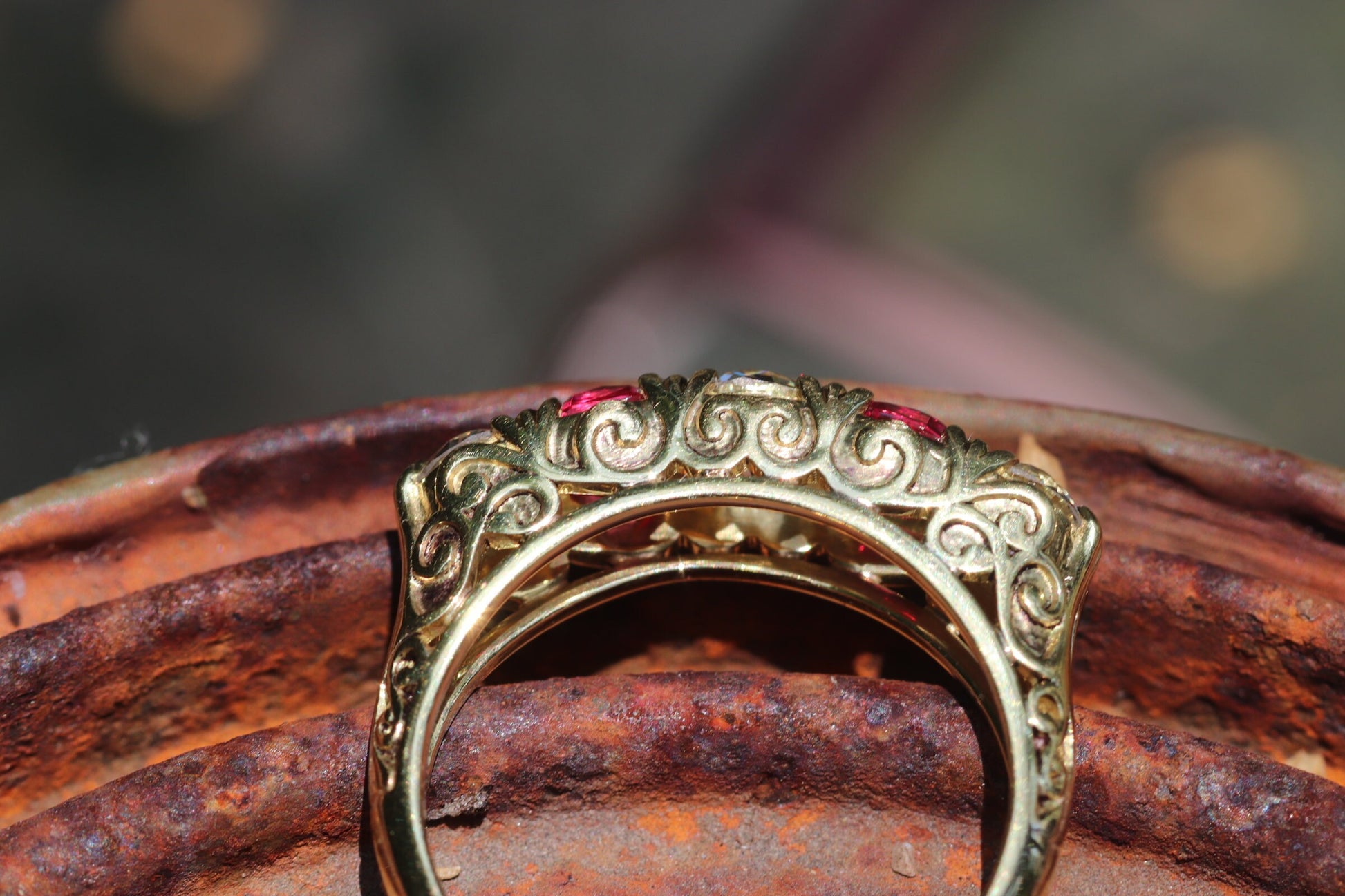 Victorian style jedi pink spinel and old European cut diamond 5-stone 18k yellow gold